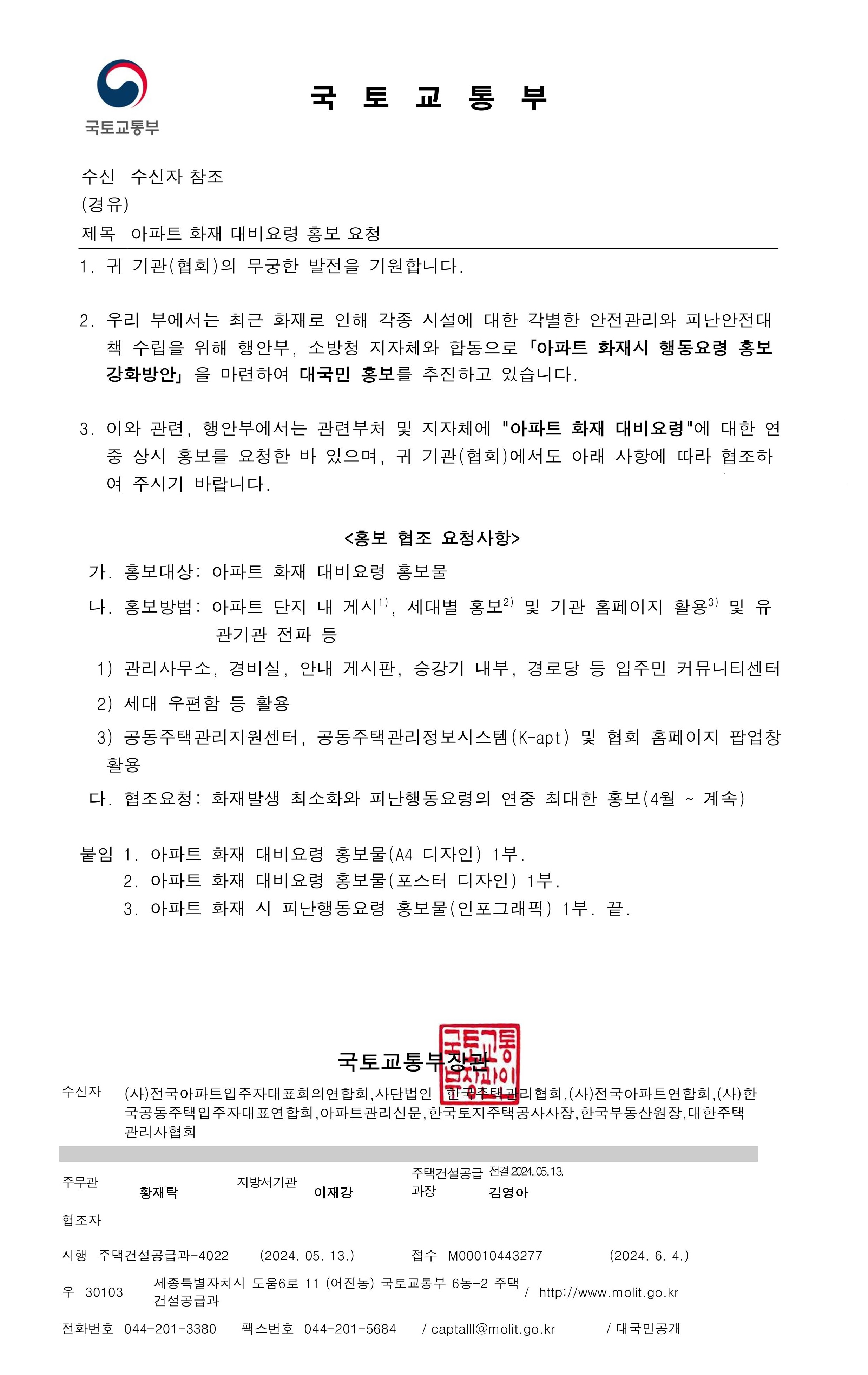 최근 화재로 인해 각종 시설 등에 대한 각별한 안전관리와 피난안전대책 수립을 위해 행정안전부는 소방청, 지자체, 국토교통부 등과 합동으로「아파트 화재시 행동요령 홍보 강화방안」을 마련하여 대국민 홍보를 추진하고 있습니다.