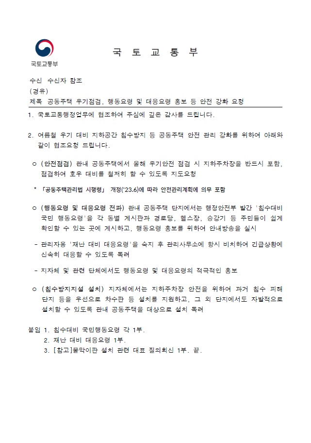 [안내] 공동주택 우기점검, 행동요령 및 대응요령 홍보 등 안전강화 요청(국토교통부)2024-06-24 10:44:47.0